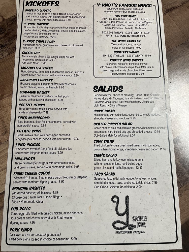 Y-Knot Sports Bar in Peachtree City, GA, is the go-to spot for American cuisine and a vibrant sports atmosphere. Offering a range of amenities such as delivery, outdoor seating, full bar, and free Wi-Fi, this bar caters to all kinds of customers. The menu boasts delicious burgers like the Bacon, Egg & Cheese or the Rodeo Burger, satisfying sandwiches like the Buffalo Chicken Wrap, and hearty salads like the Cobb Salad. Customers rave about the welcoming staff, great food, and lively environment, making it the perfect place to catch a game with friends and family. With ample parking and a diverse selection of dishes, Y-Knot Sports Bar is a neighborhood gem not to be missed.